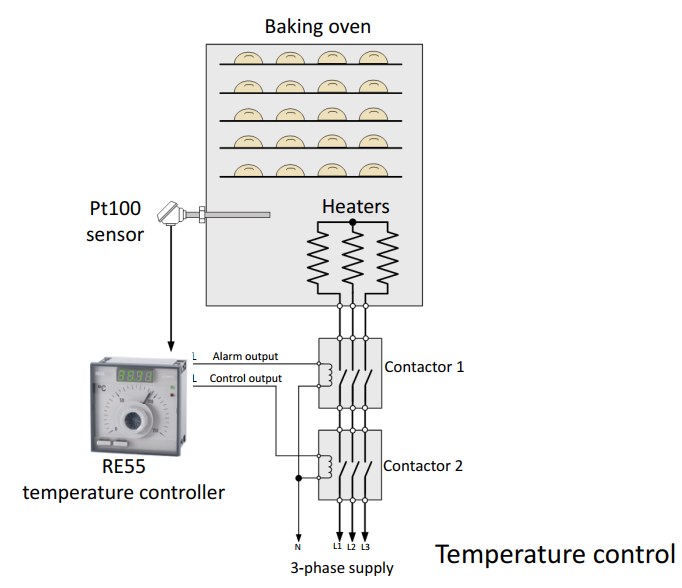 RE55 este un controler cu afisare analogica si masurare digitala. Controleaza temperatura prin comutarea start/stop a dispozitivului de putere, in concordanta cu valoarea de referinta setata. Functioneaza cu senzori de temperatura (RTD) sau termocuple (TC). Este conceput pentru controlul temperaturii in industria plasticului, in industria alimentara, deshidratarea alimentelor si oriunde este necesar controlul temperaturii.