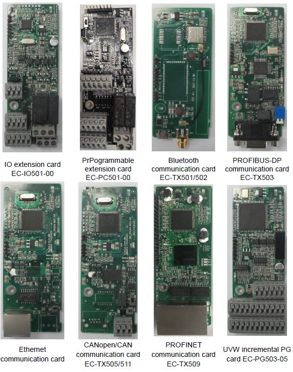 | Optiuni | card extensie I/O (expandor) EC-IO501-00, card PLC EC-PC502, card sursa auxiliara 24 V c.c. EC-PS501-24, Convertor USB/RS485 HWPATC820 |