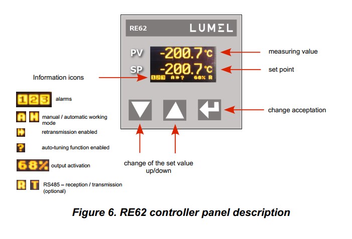 Controler Lumel RE62 41000E0, RTD, TC, -100…1370°C, AI, 2 relee, iesire 0/5 V, 24 V, 110 V, 230 V – Controlere – RE62 este destinat controlului temperaturii sau a altor marimi fizice (presiune, umiditate, nivel, etc